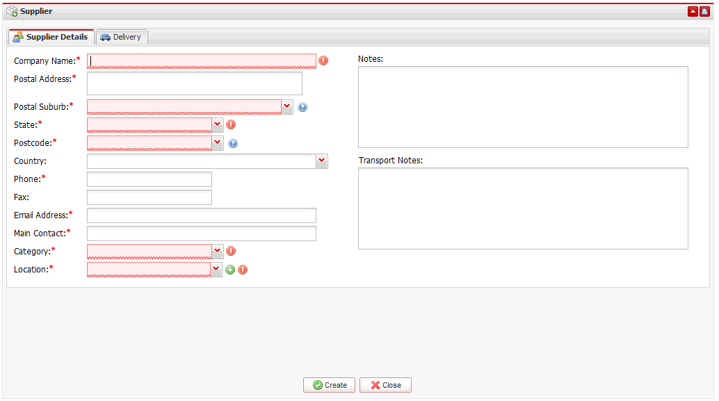 The form displayed will allow you to record all the necessary information about your new supplier. The required fields are clearly marked. When done entering the info just click Create to save the entered data.