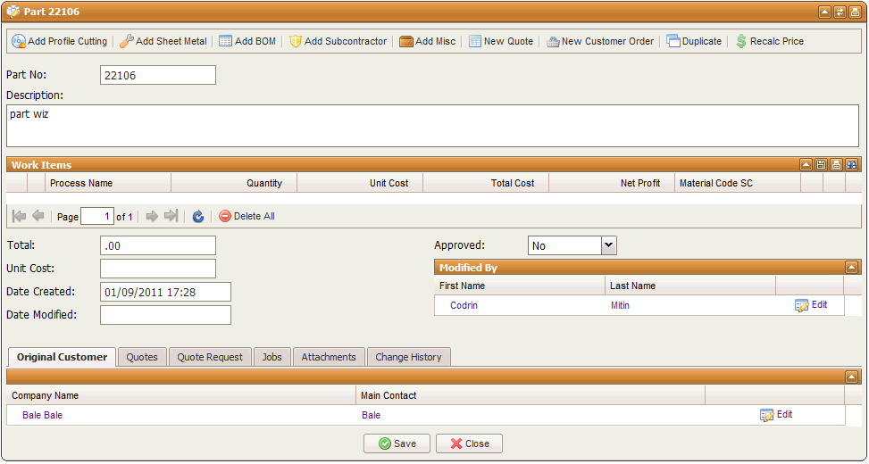 A part creation wizard will pop up and prompt you for the part details ( name / part number etc.) and optionally ask if you would like to associate this part to any one client. Click Create when done.