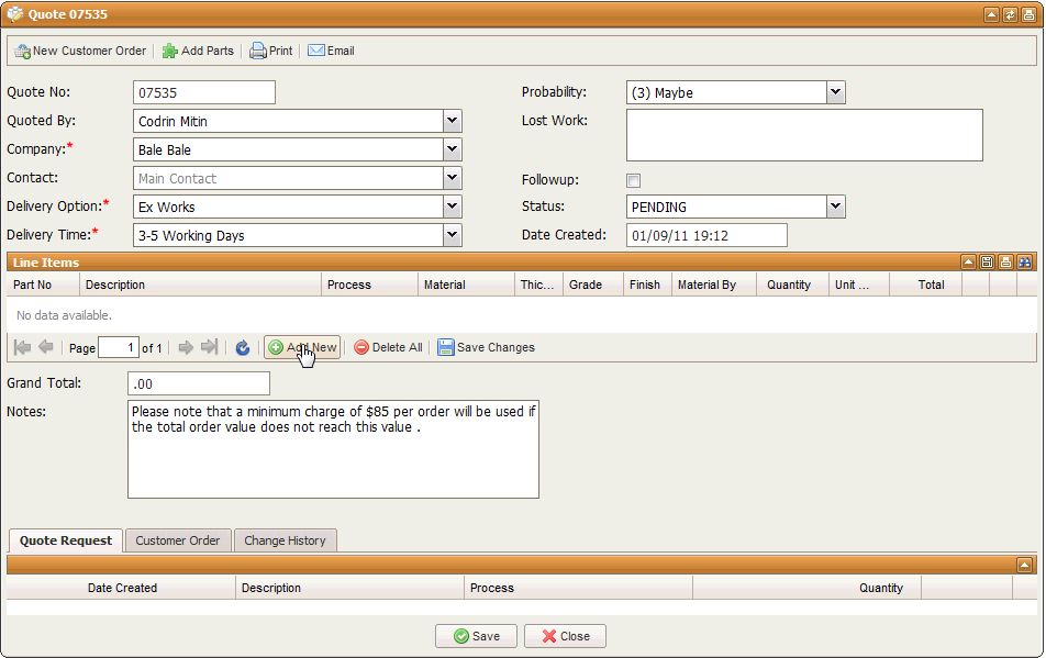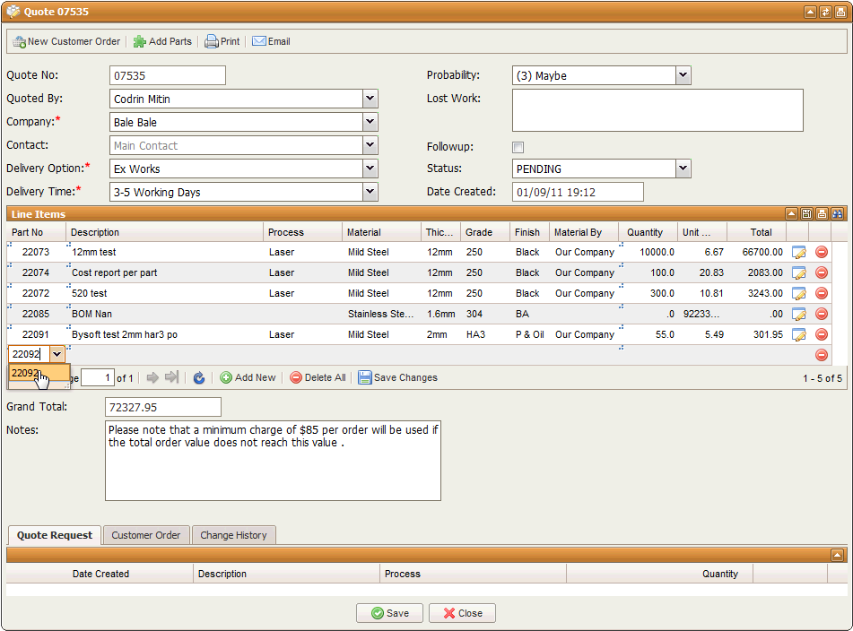 When you finished adding parts you can email or print the quote by selecting these buttons from the top toolbar . You can also create a Customer Order straight from the Quote .
