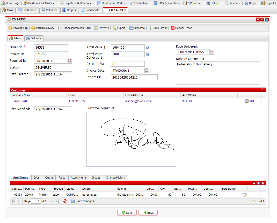 6. Customer Order records now permanently the time and date of delivery including the actual signature. If your customer has access online to their records they will be able to view this proof of delivery.