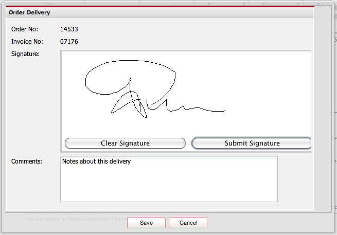 This menu option allows the recording of an actual signature for a given delivery. You require a device capable of recording free motion on screen like a touch-screen or a stylus enabled PC.
