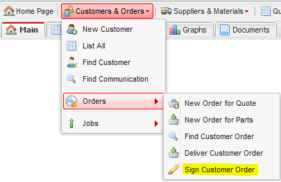 1. Navigate to the top Menu and select : Customers & Orders > Orders > Sign Customer Order
